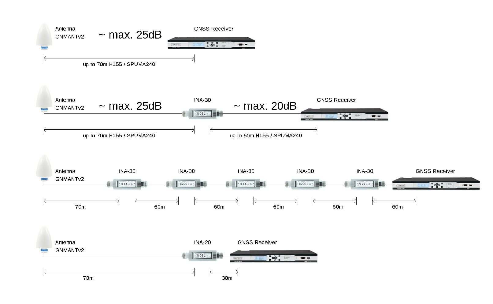 The INA-20 and INA-30 are 20db and 30db amplifiers respectively and can be chained together to allow for extremely long cable runs. The 30db amplifiers with the GNMANTv2 can extend the cable run by approximately 60m (when used with Speedfoam 240HFJ 50Ohm antenna cable or Belden H155)